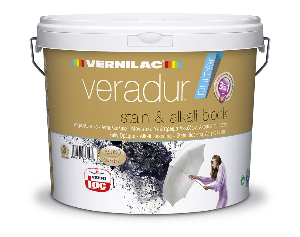 Το VERADUR STAIN & ALKALI BLOCK είναι λευκό, υπερκαλυπτικό, μονωτικό υπόστρωμα νερού, ειδικά σχεδιασμένο για να μονώνει και να καλύπτει μαυρίλες, κιτρινίλες, καυσαέρια και λεκέδες από καπνό, νικοτίνη, μούχλα, καφέ, χυμούς, υδροδιαλυτούς μαρκαδόρους και άλλους ρύπους. Έχει μεγάλη καλυπτική ικανότητα, υψηλή απόδοση, γρήγορο στέγνωμα και εφαρμόζεται σε όλους τους εσωτερικούς και εξωτερικούς τοίχους εξασφαλίζοντας ισχυρή πρόσφυση, θαυμάσιο άπλωμα και τέλειο φινίρισμα σε όλα τα πλαστικά και ακρυλικά χρώματα. Η χρήση του VERADUR STAIN & ALKALI BLOCK αποτελεί την ασφαλέστερη μέθοδο προετοιμασίας όλων των λεκιασμένων οικοδομικών επιφανειών γιατί χάρη στη μοναδική διπλή σύνθεσή του εξασφαλίζει τη μόνωση υδροδιαλυτών ρύπων εμποδίζοντάς τους να μεταναστεύσουν στην επιφάνεια του χρώματος, ενώ ταυτόχρονα εξισορροπεί την απορροφητικότητα εσωτερικών και εξωτερικών επιφανειών, επιτρέποντας την υψηλή διαπνοή τους. Με ειδικές ακρυλικές ρητίνες νέας τεχνολογίας στη σύνθεσή του, το VERADUR STAIN & ALKALI BLOCK αντιστέκεται στην έντονη αλκαλικότητα των επιφανειών όπως φρέσκο μπετόν, καινούργιοι σοβάδες, σπατουλαριστοί τοίχοι  κ.ά. Χάρη στη μοναδική υπερκαλυπτική ικανότητά του, λειτουργεί άψογα και ως ενδιάμεση στρώση, για το πέρασμα από σκούρες σε ανοιχτές αποχρώσεις, μειώνοντας τα επιπλέον «χέρια» που θα απαιτούνταν σε τελικό χρώμα. Δεν περιέχει αμμωνία και είναι σχεδόν άοσμο.